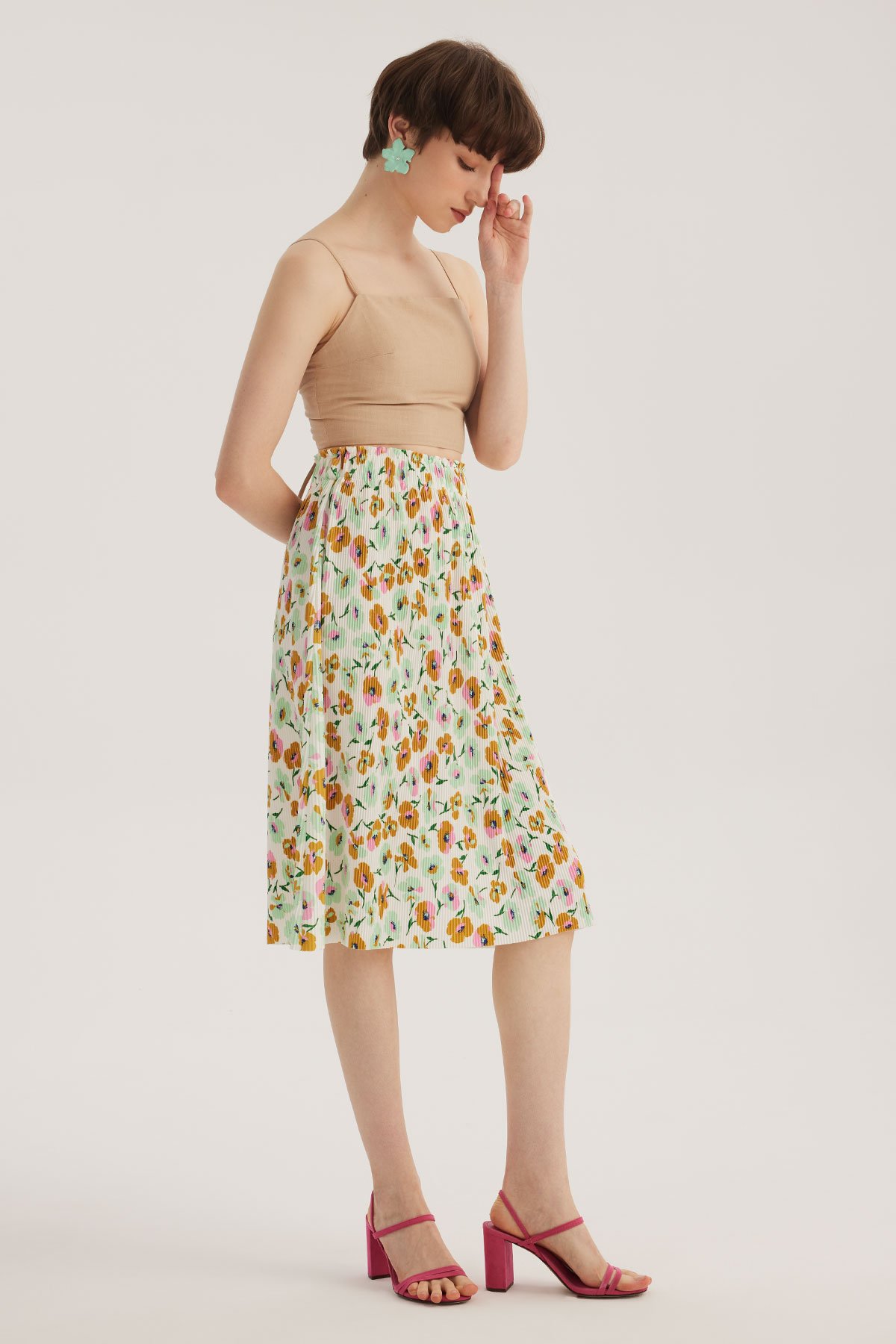 White Floral Printed Pleated Midi Skirt (SPN23-767-00200234)